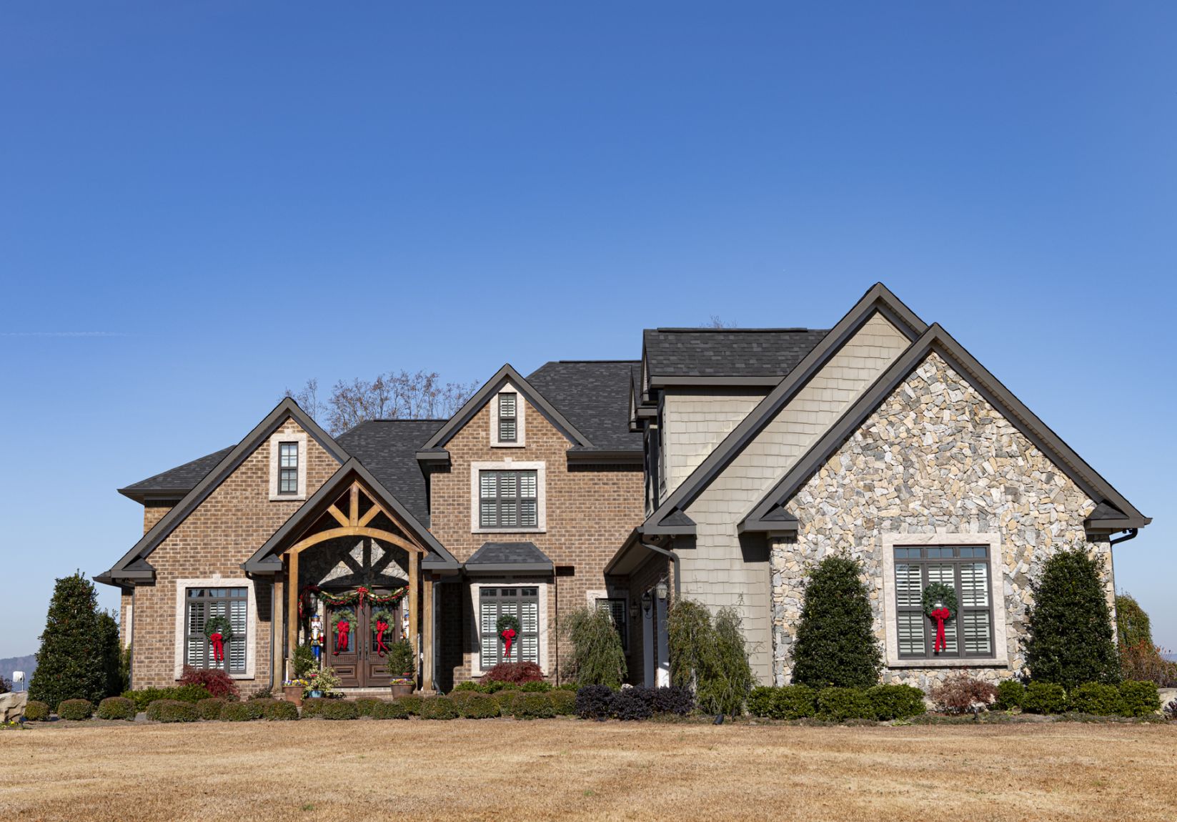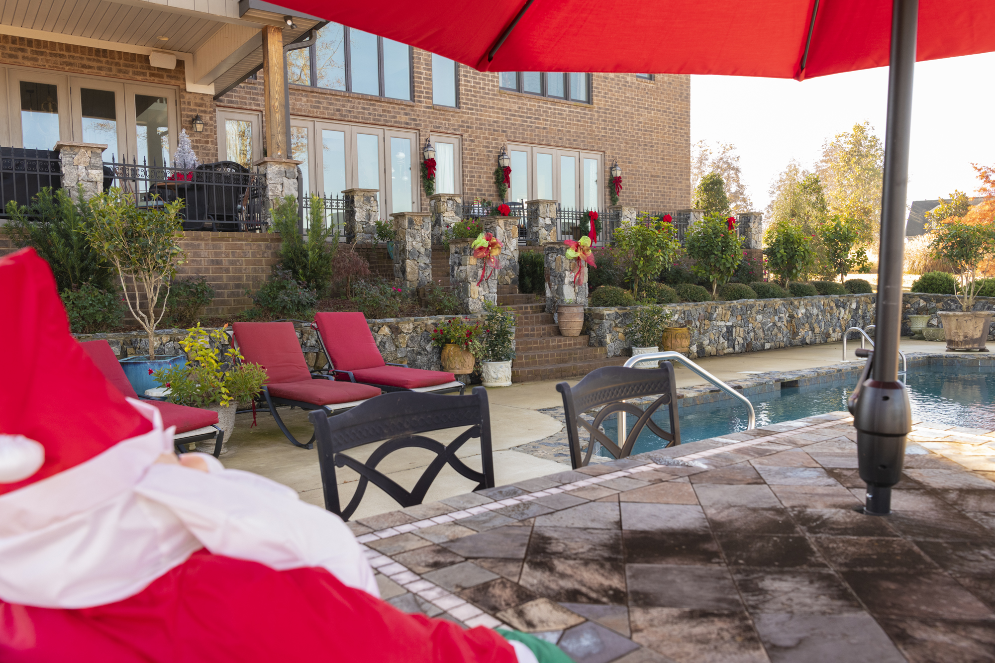 Stepping from the family room to the outdoors, one can imagine lounging at a favorite vacation spot at the beach. An attractive stone patio — built from rock similar to the stone of the house — is steps away, along with the pool. Adding more Christmas flair, the pool area is outfitted with colorful red umbrellas and comfy loungers with red seat cushions, providing a relaxing setting for entertaining friends and family.