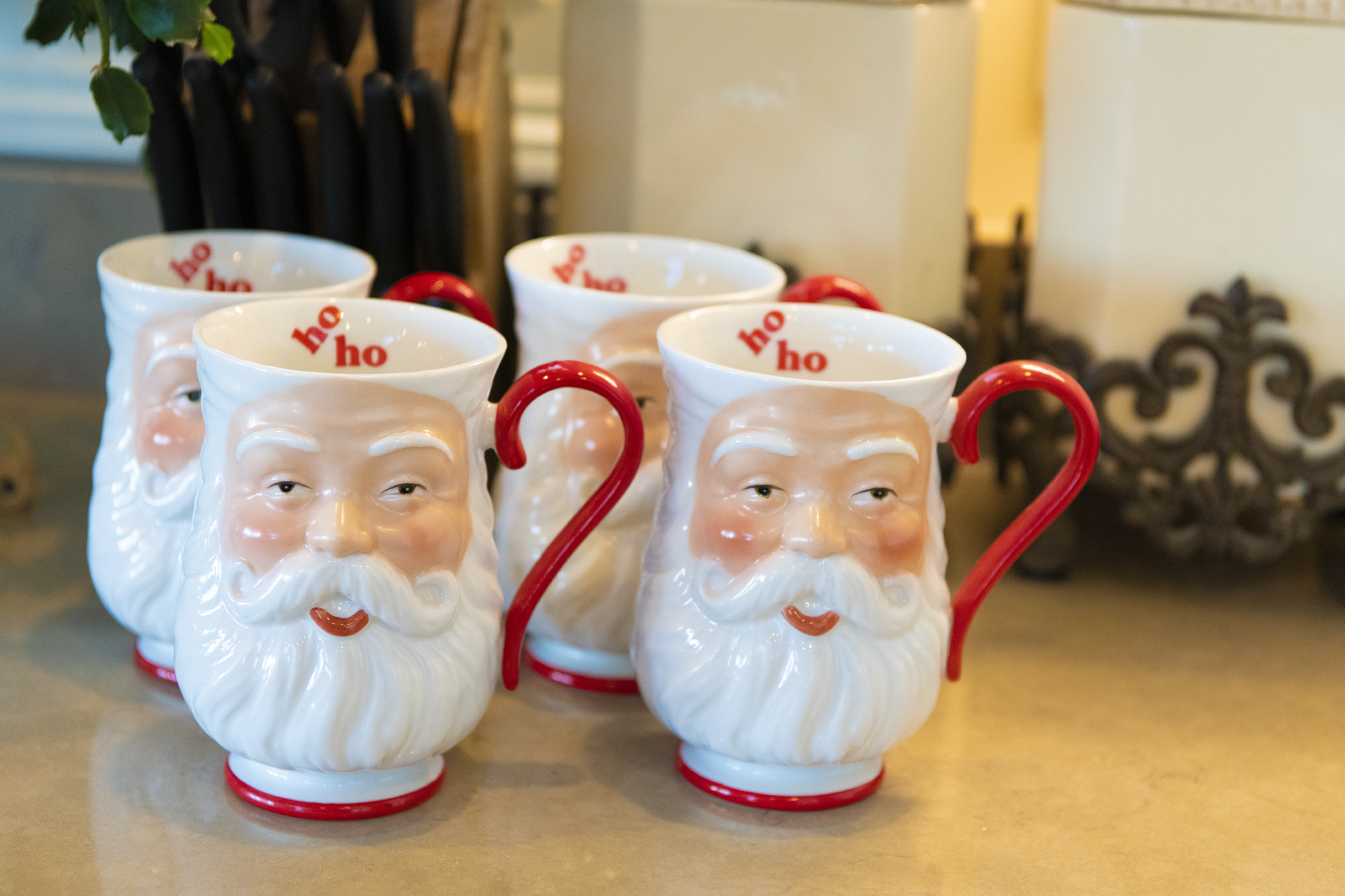 As the center of hearth and home, the kitchen has many luxurious touches. Numerous bright, white cabinets and drawers provide plenty of storage for implements needed to whip up delicious gourmet meals. Befitting the holiday season, the cabinets are draped in red ribbons. Janet’s beloved Santa cups await hot chocolate next to the stove.