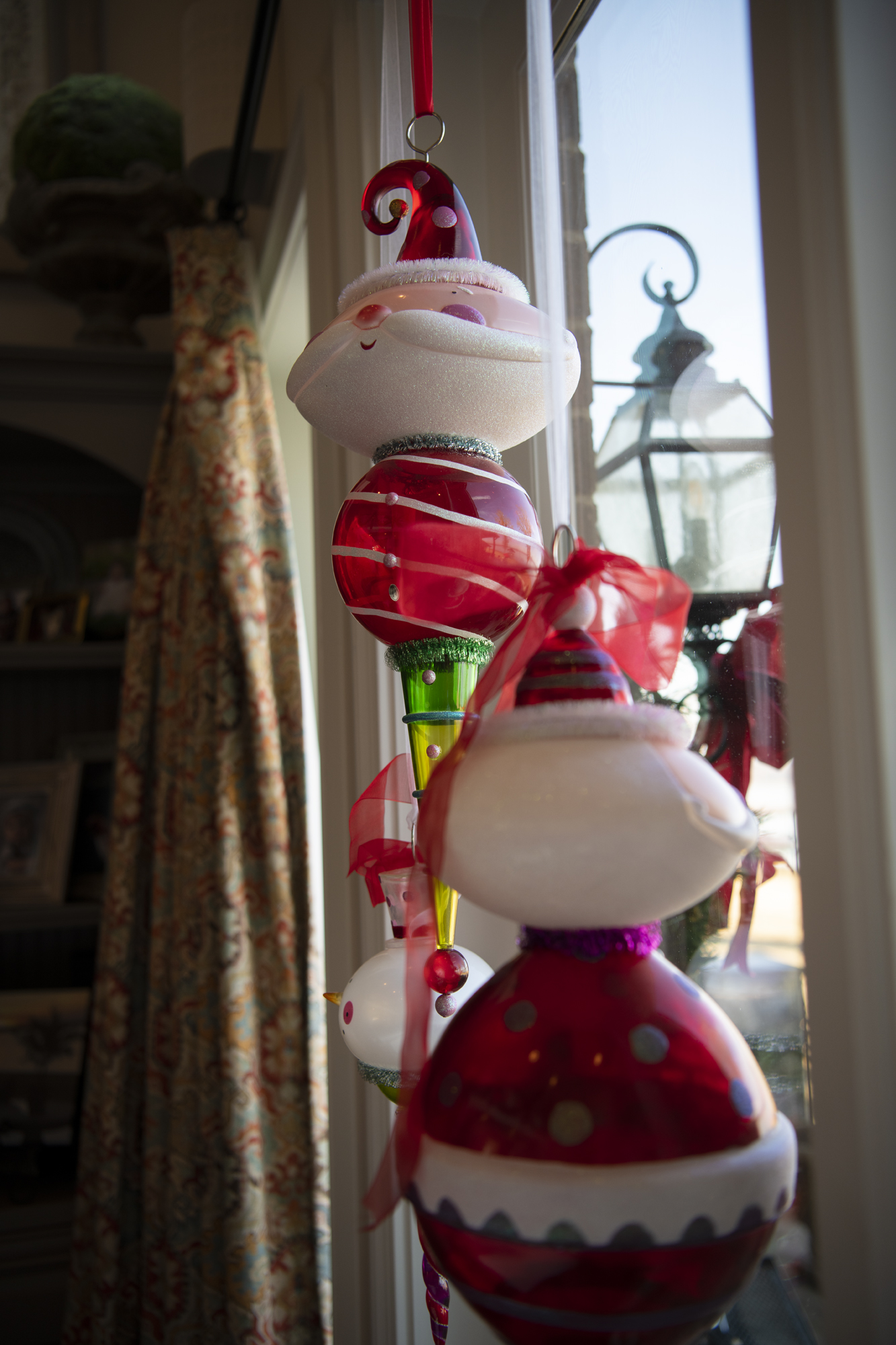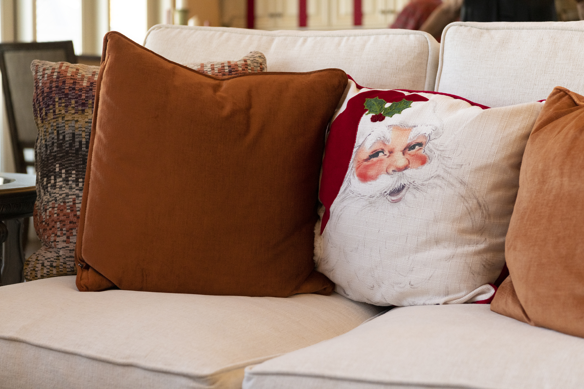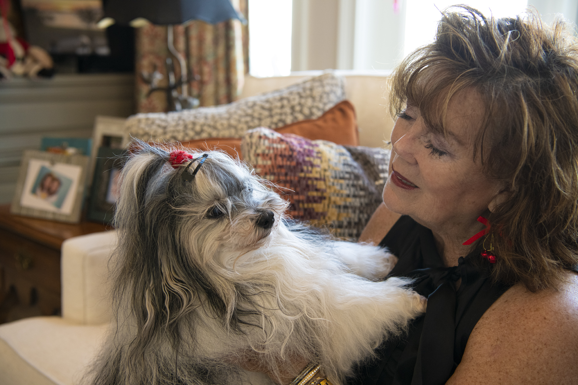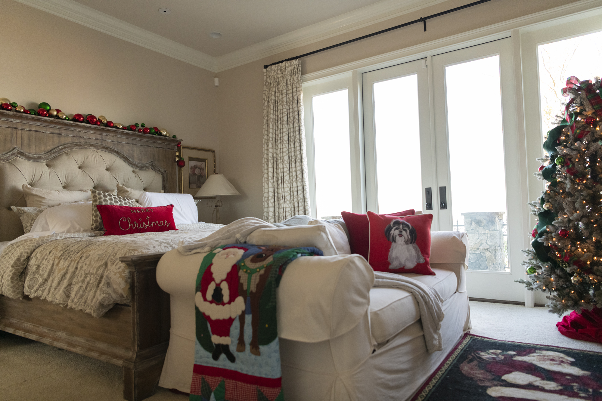 Janet recently selected new couches and chairs, covered in white fabric that adds to the room’s light and bright feel. A Santa pillow adds whimsy. Custom-made curtains — a muted mixture of beige, coral and teal — echo the colors of the floor rug while framing the windows. Seated beneath the tree, the family’s black-and-white Havenese, Lexi, could be a stuffed toy.