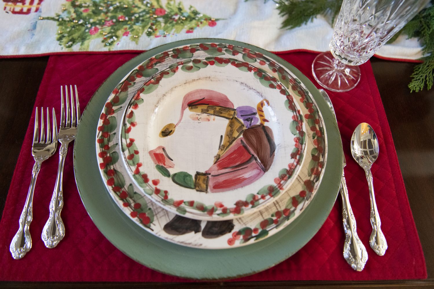 The coffered wood ceiling in the dining room adds to the soaring space. Janet delights in serving Christmas meals on treasured Vietri china — the Old St. Nick pattern — handmade in Italy. A metal-and-glass bar cart in the corner holds crystal wine glasses as Santa looks on from a wreath at the window. At left, a small Christmas tree is loaded with colorful decorations.
