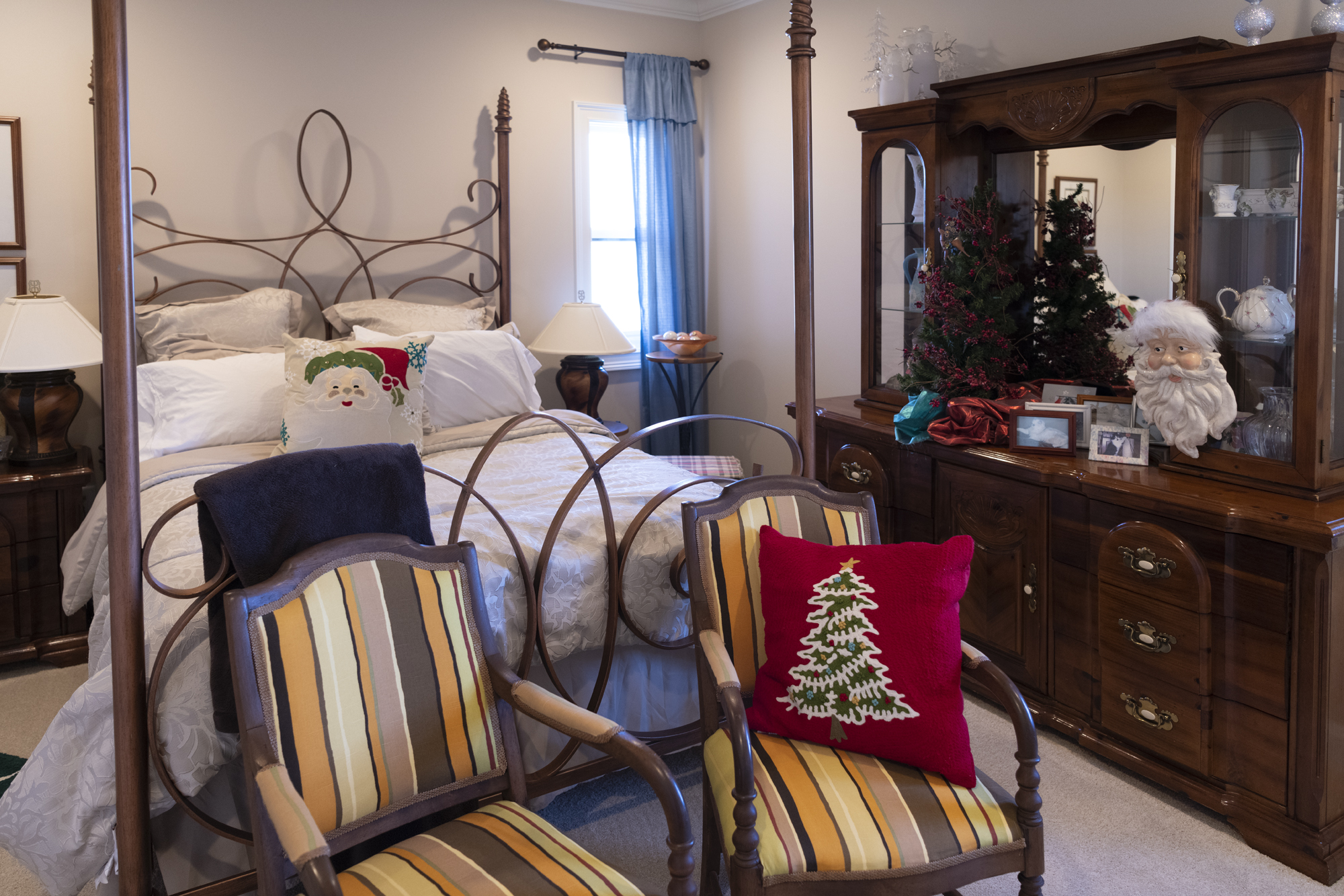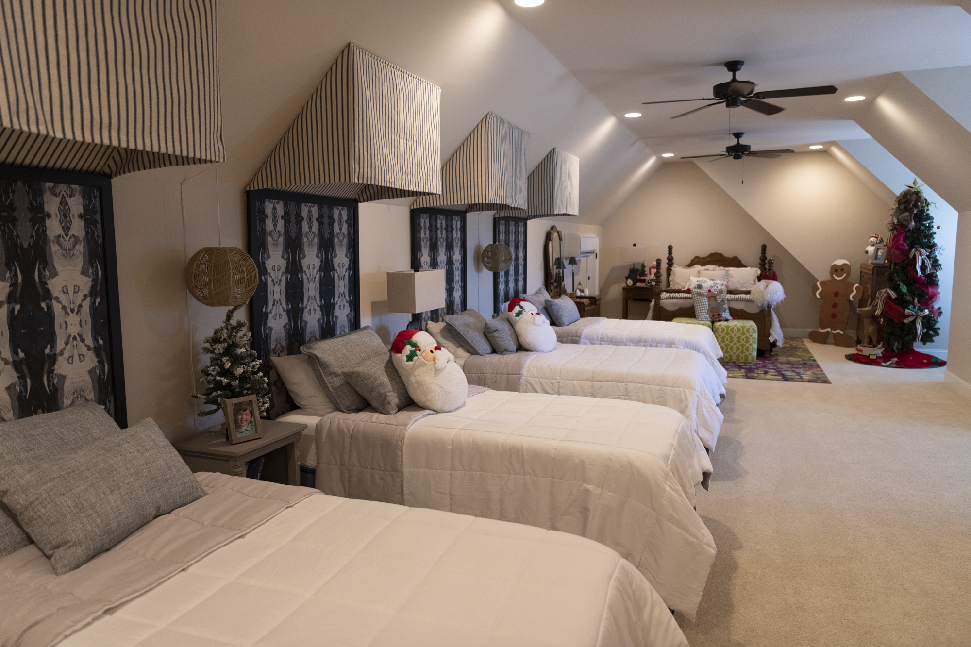 Upstairs, the five bedrooms have their own trees, bedecked in ornaments. One tree pays homage to her sons’ years at Auburn University. A beribboned tree welcomes the grandchildren to their immense “bunk room,” with one queen- and four twin-size beds with Santa pillows. An interior designer added upholstered coronets above the twin beds, matching the lake’s deep blue hues.
